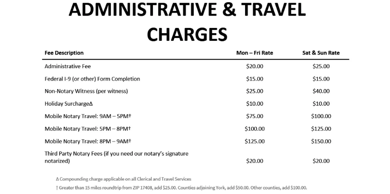 Many Notaries do however assess administrative fees to cover their travel or their overhead such as rent, copies, and record keeping. These fees are appropriate as long as they are indicated as separate from the State fee, and they may vary from notary to notary.